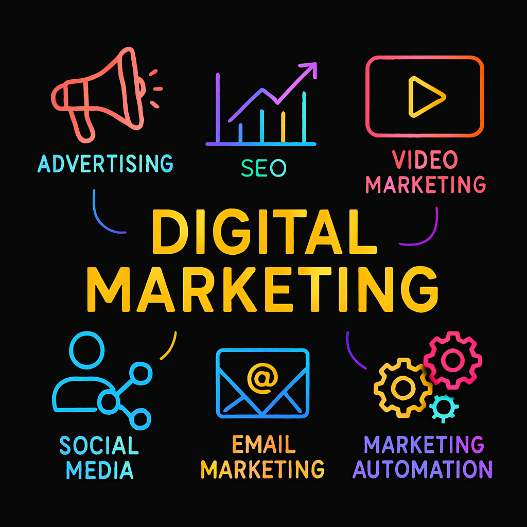 Digital marketing refers to promoting products, services, or brands using online channels such as search engines, social media, websites, email, video platforms, and mobile apps.